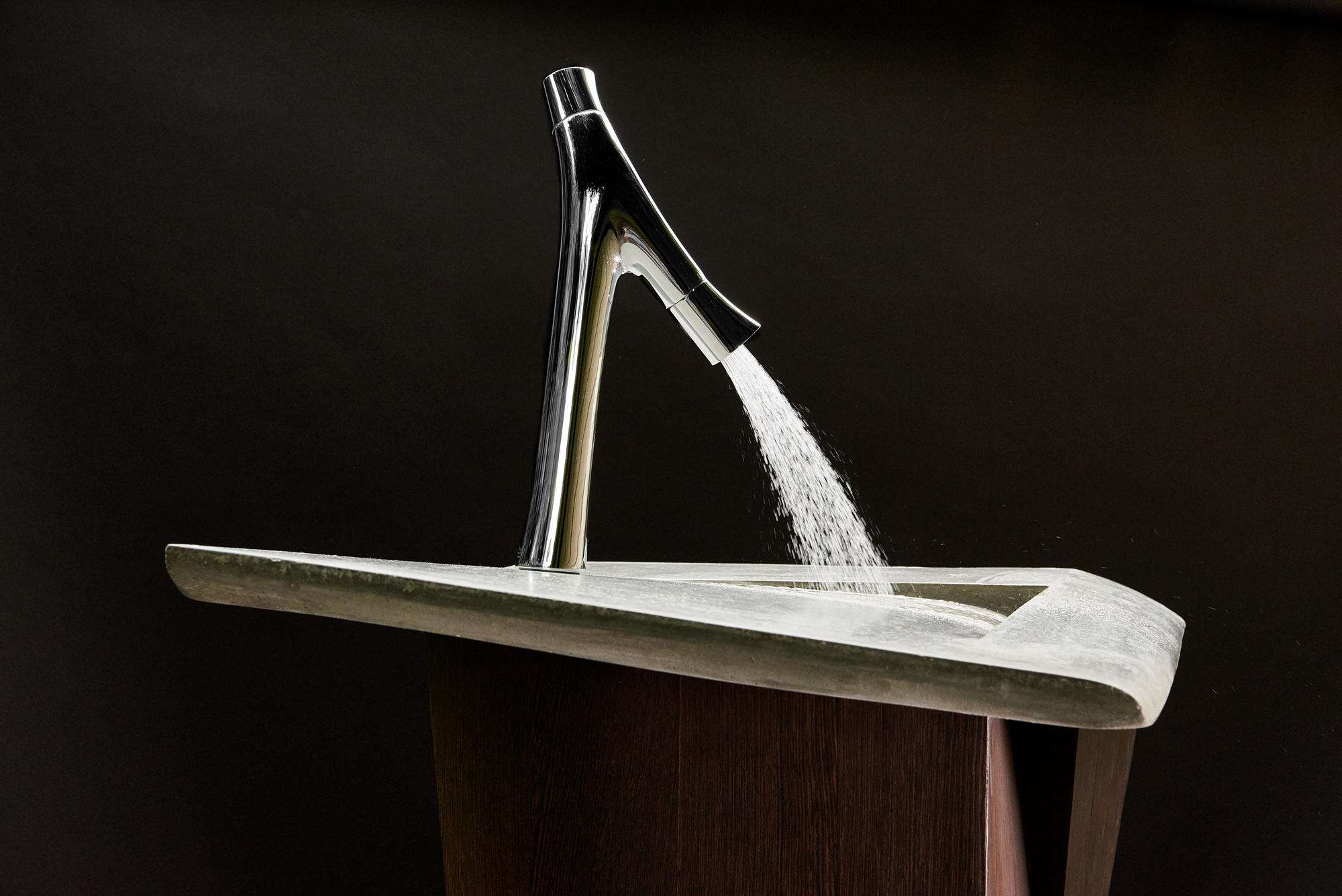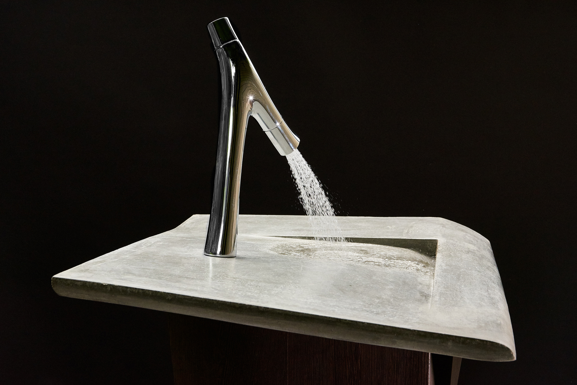 Um das zu realisieren, war präzises Handwerk gefragt, bei dem auch das optimale Zusammenspiel von Armatur und Waschtisch eine entscheidende Rolle spielt, denn natürlich limitiert diese Form die Funktion. Erforderlich ist eine Armatur., die die Wassermenge ebenso begrenzt, wie die vom Wasser berührte Fläche – en passant auch noch Beitrag zum Wasser sparen durch besonderes Design.