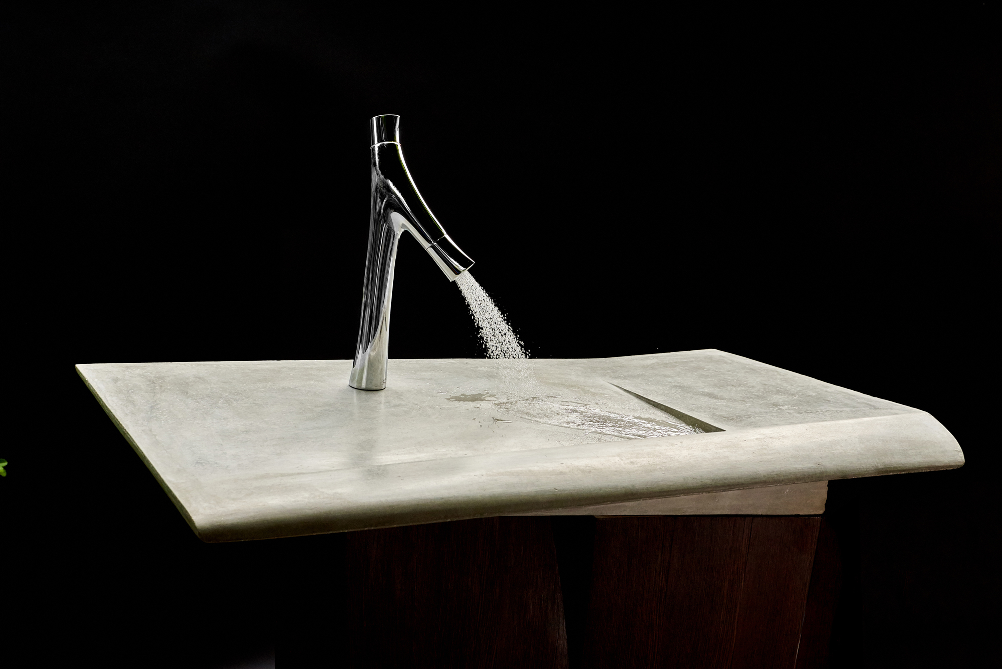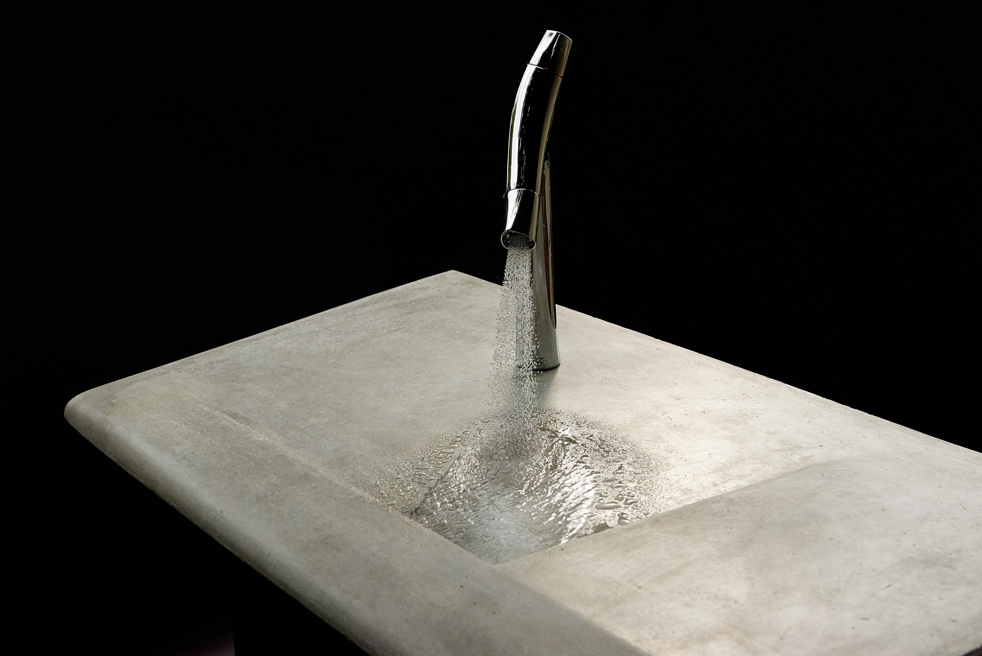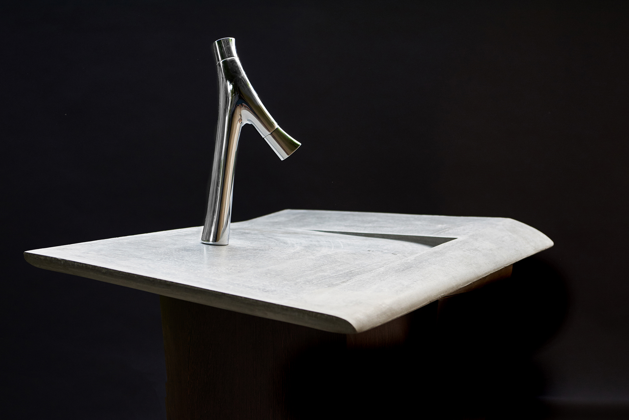 Braucht es tatsächlich immer ein tiefes Becken? Oder ist eine grössere Ablage- und Arbeitsfläche nicht sinnvoller? Das war Ausgangspunkt für das Design dieses Waschtisches. Und natürlich spielte die Idee, Beton zu verdrehen und ihn möglichst ohne Rechte Winkel zu gestalten, als herausragenden Merkmale im Design von Christoph Pesch eine Rolle. Herausgekommen ist ein Objekt, dass die Funktion hinter der Form erst auf den zweiten Blick verrät. Bei entsprechender Beleuchtung verschwimmt es geradezu mit der Umgebung und dem Wasser, das es auf geheimnisvolle Weise unsichtbar entsorgt. Ein sehr besonderer Waschtisch und Hingucker in jedem Bad.